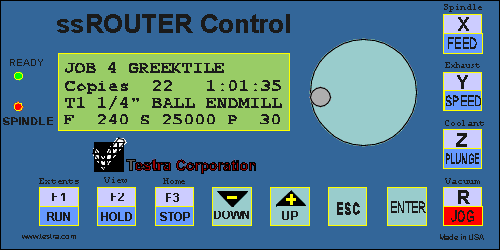 The program that gives the panel its operational characteristics is part of the ssROUTER firmware stored in the ss4544 system. The standard version is suitable for a wide variety of machines, but is customizable for OEM's. There is also a standard version available for control of Laser Engraver/Cutting machines. Click on ssLASER if you want to look at that specification. It is possible to have a dual functiion mechanical/laser cutting/engraving machine, and switch back and forth between the two applications.